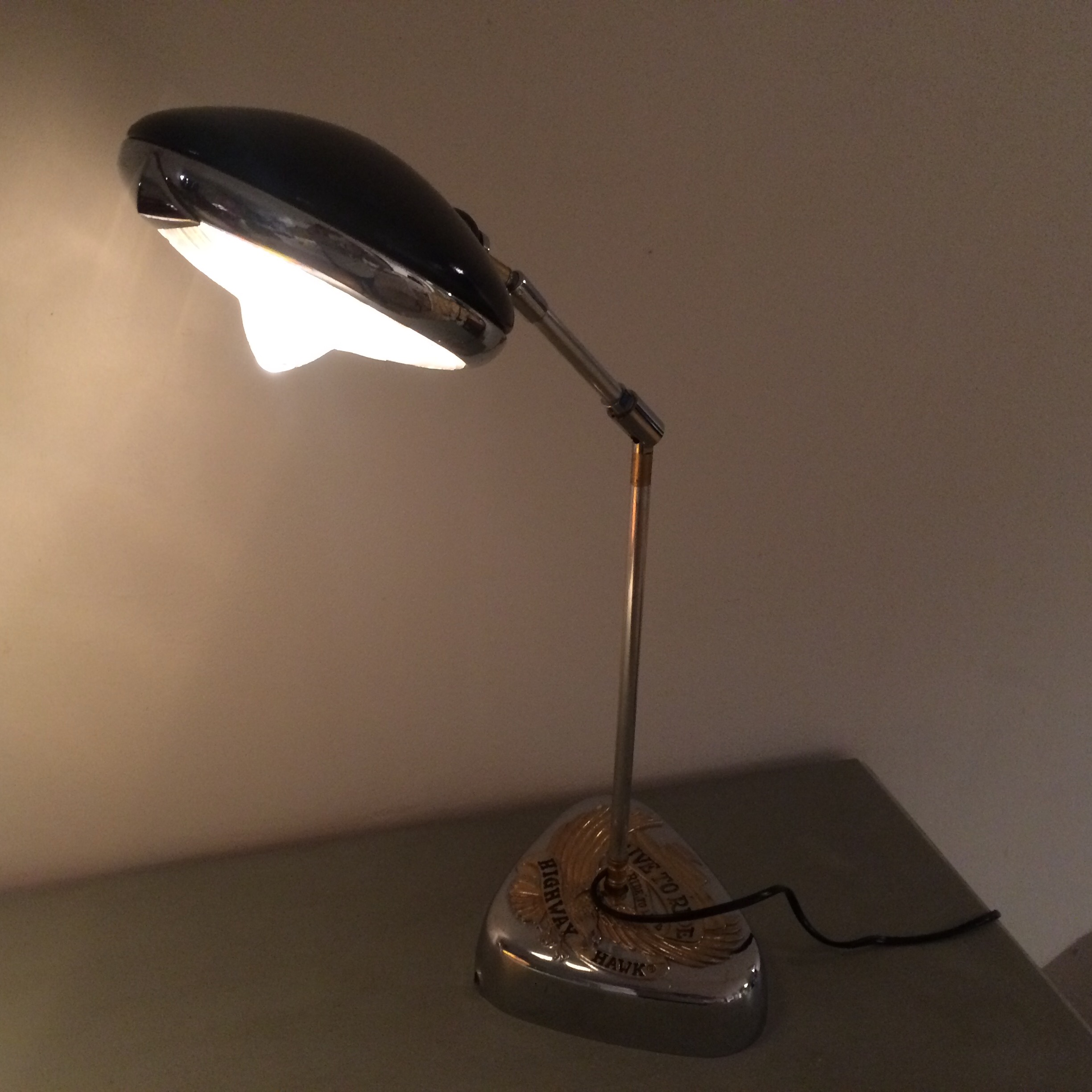 Lampe réalisée à partir d'un phare acethilene Luxor. Le socle est un cache culbuteur de 2cv...