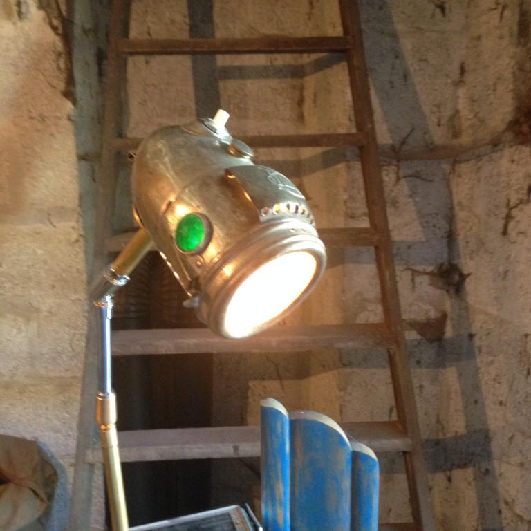 Lampe réalisée à partir d'un phare acétylène des années 1930 de marque LUXOR 2 petits témoins diamant rouge et vert sont po...