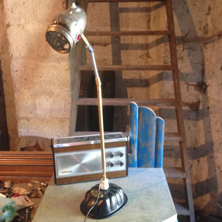 Lampe réalisée à partir d'un phare acétylène des années 1930 de marque LUXOR 2 petits témoins diamant rouge et vert sont positionnés chaque coté de la lentille. 2 rotules permettent de régler la lampe selon votre idée. Le socle est un cache culbuteur de 2cv surmonté d'un isolateur en porcelaine.