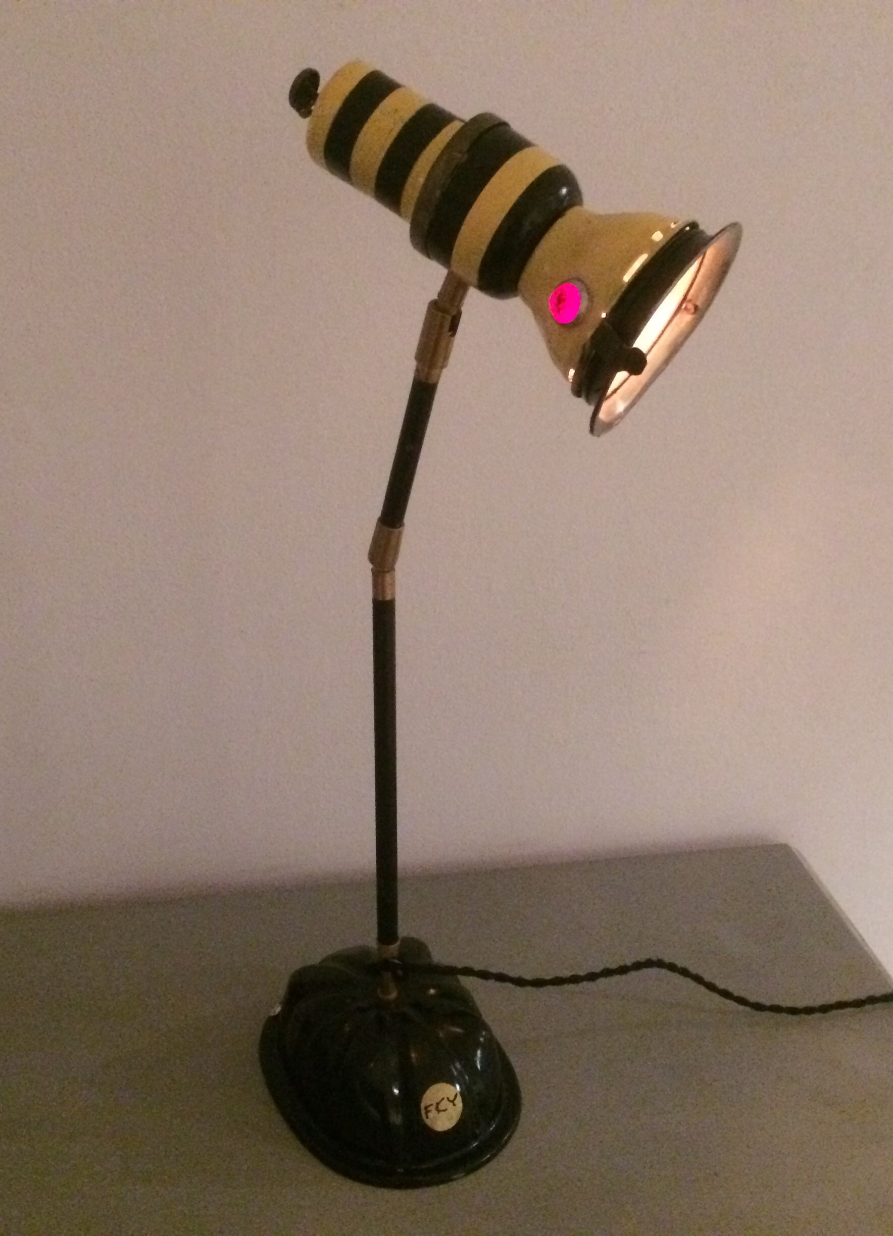 Lampe réalisée à partir d'un phare acethilene Luxor. Le socle est un cache culbuteur de 2cv...