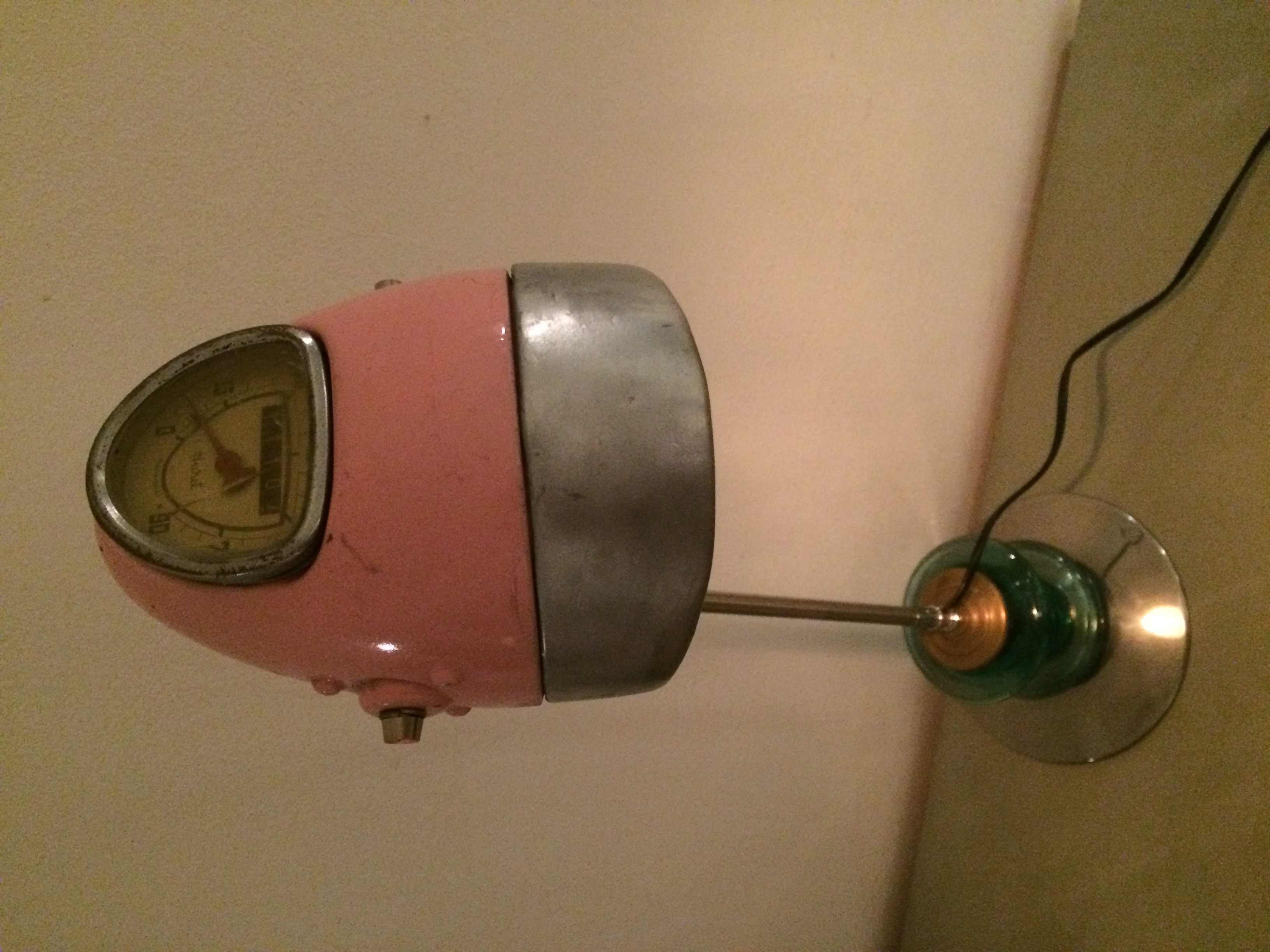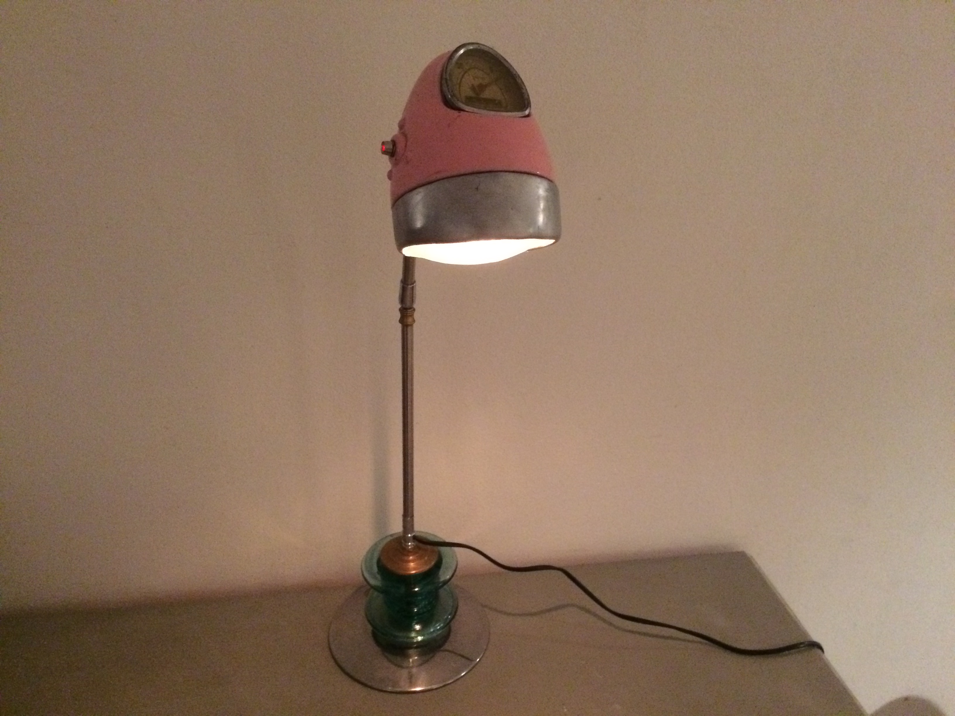 Lampe faite à partir d'un phare qui équipait les Paloma, petite moto 49cc années 60. Le socle est un enjoliveur de roue surmonté d'un isolateur.