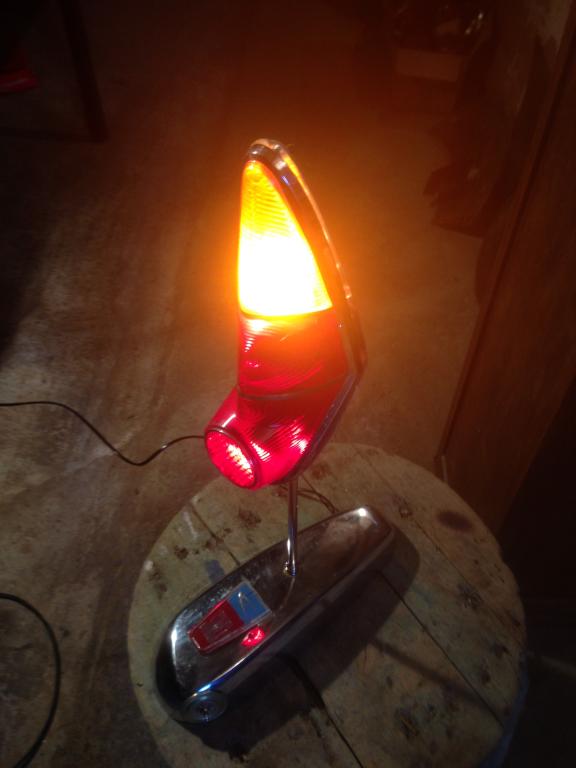 Lampe réalisée à partir d'un feu arrière de Simca Versailles des années 50/60. le socle est un cache réservoir de mobylette...