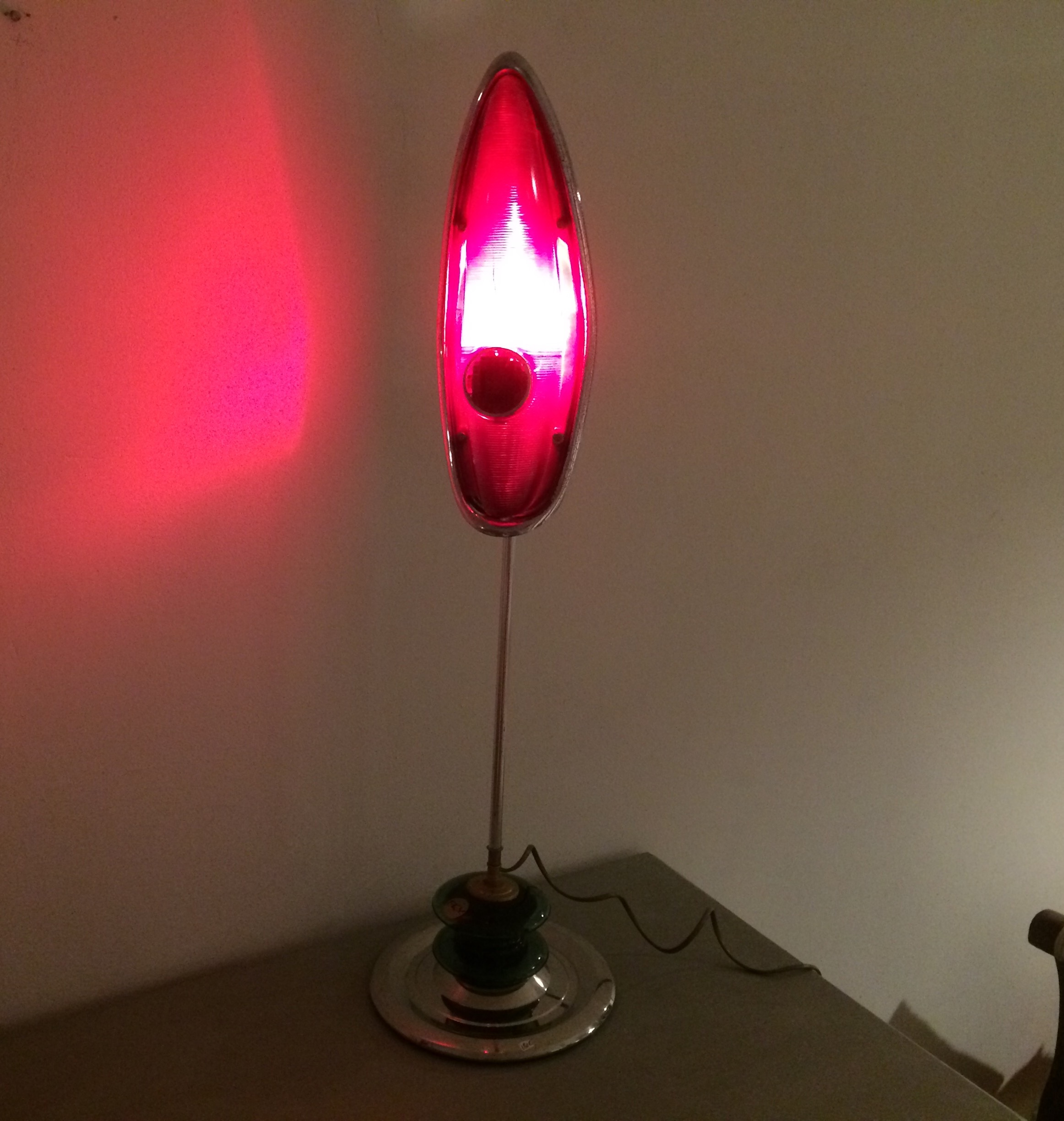 Lampe réalisée à partir d'un feu arrière d'une Simca Ariane. Véhicule style américaine des années 60. Le socle est un enjoliveur de roue.
