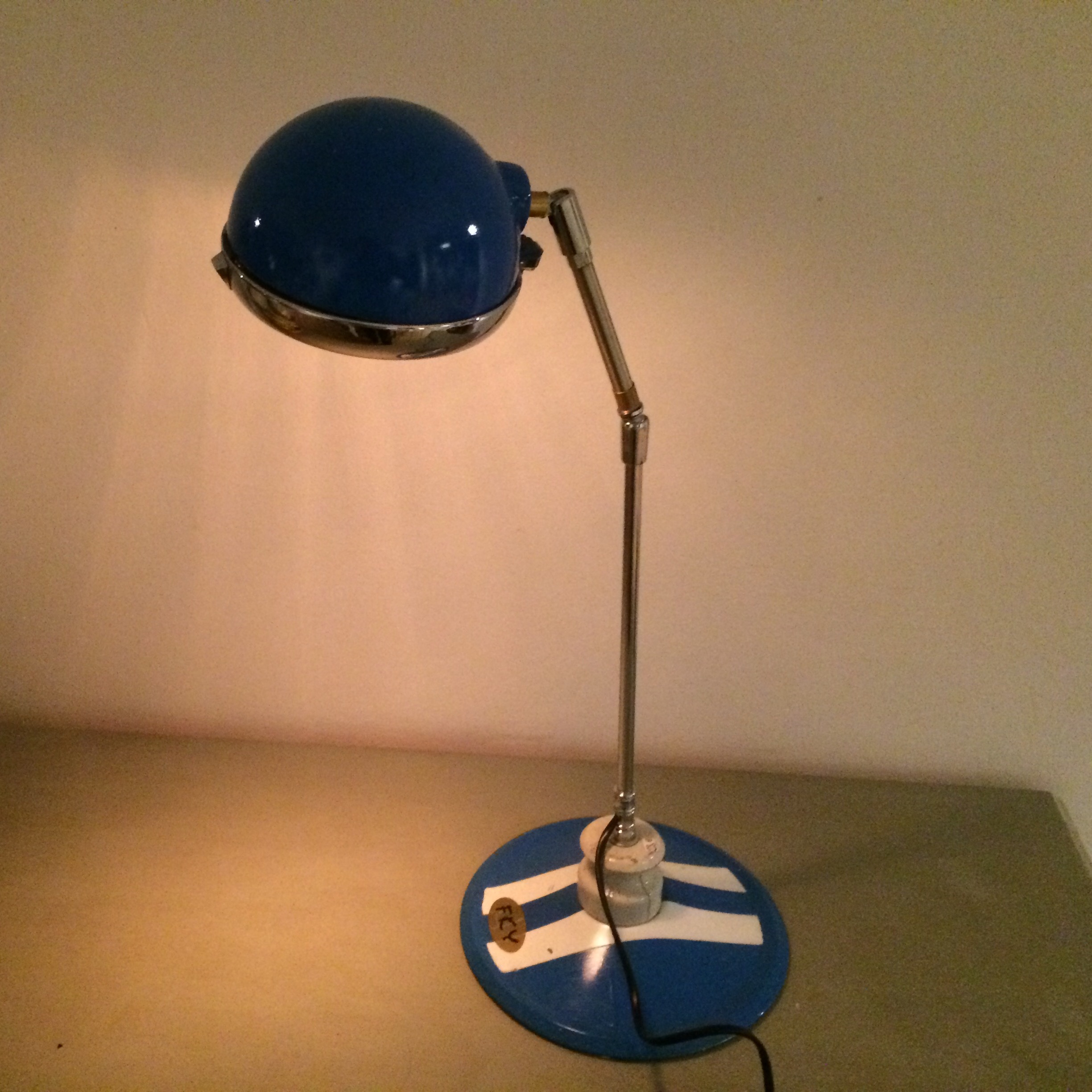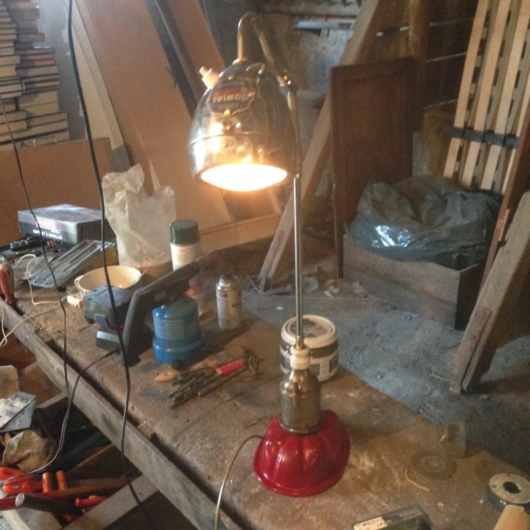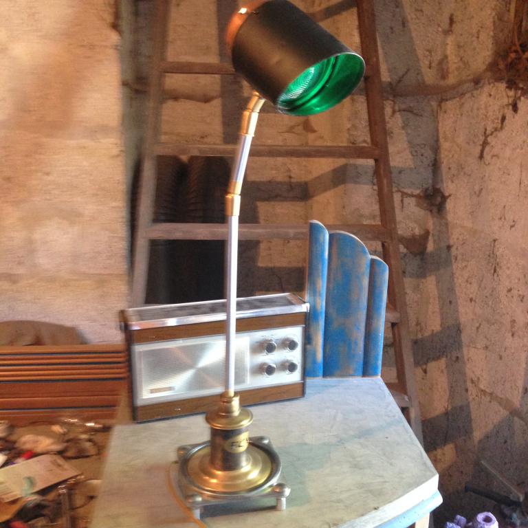 Lampe réalisée à partir d'un phare acethilene Luxor. Le socle est un cache culbuteur de 2cv...
