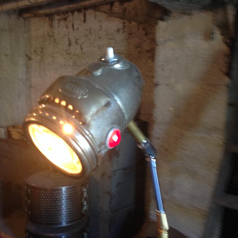Lampe réalisée à partir d'un phare acétylène des années 1930 de marque LUXOR 2 petits témoins diamant rouge et vert sont po...