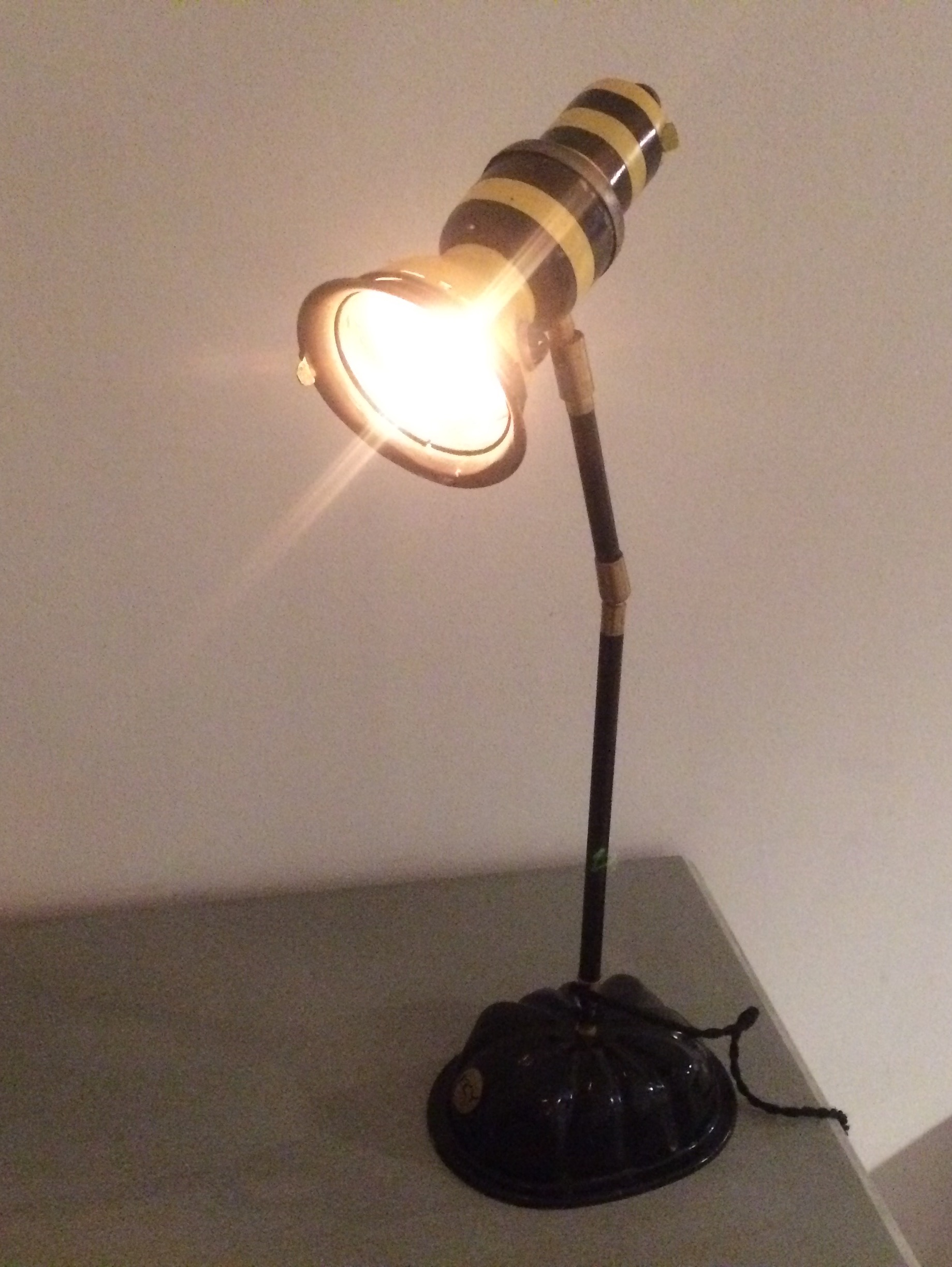Lampe réalisée à partir d'un phare acethilene Luxor. Le socle est un cache culbuteur de 2cv...