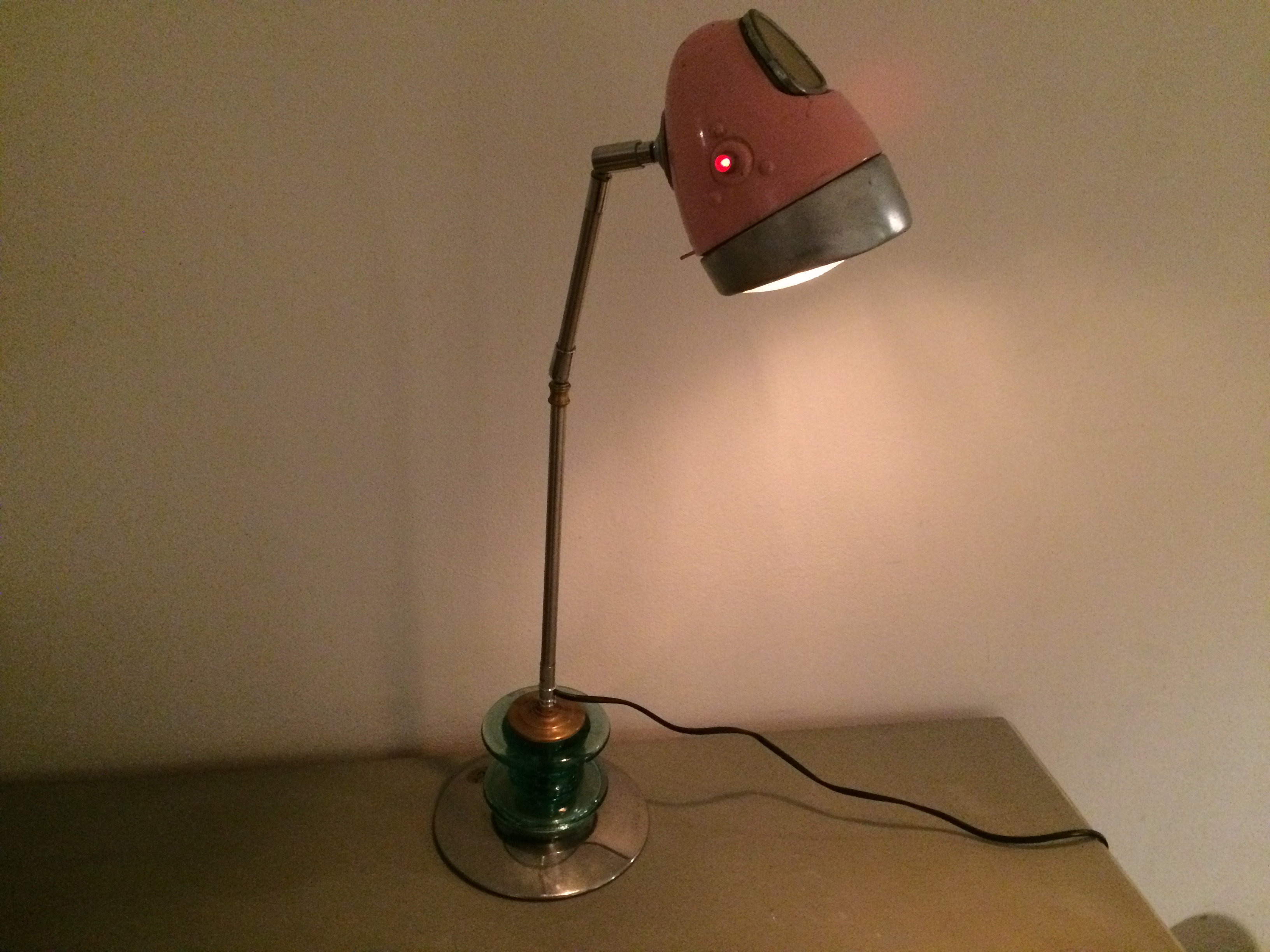 Lampe faite à partir d'un phare qui équipait les Paloma, petite moto 49cc années 60. Le socle est un enjoliveur de roue surmonté d'un isolateur.
