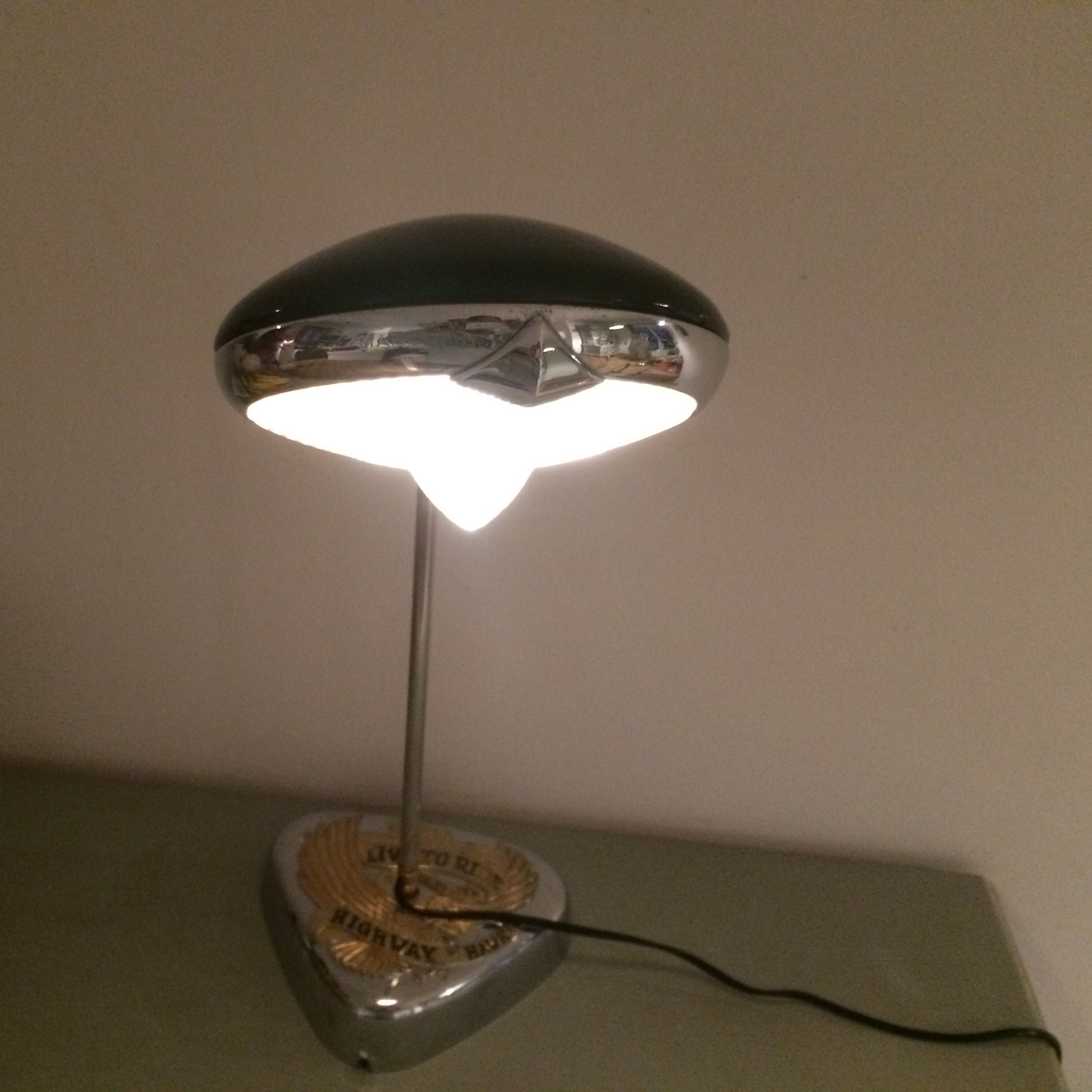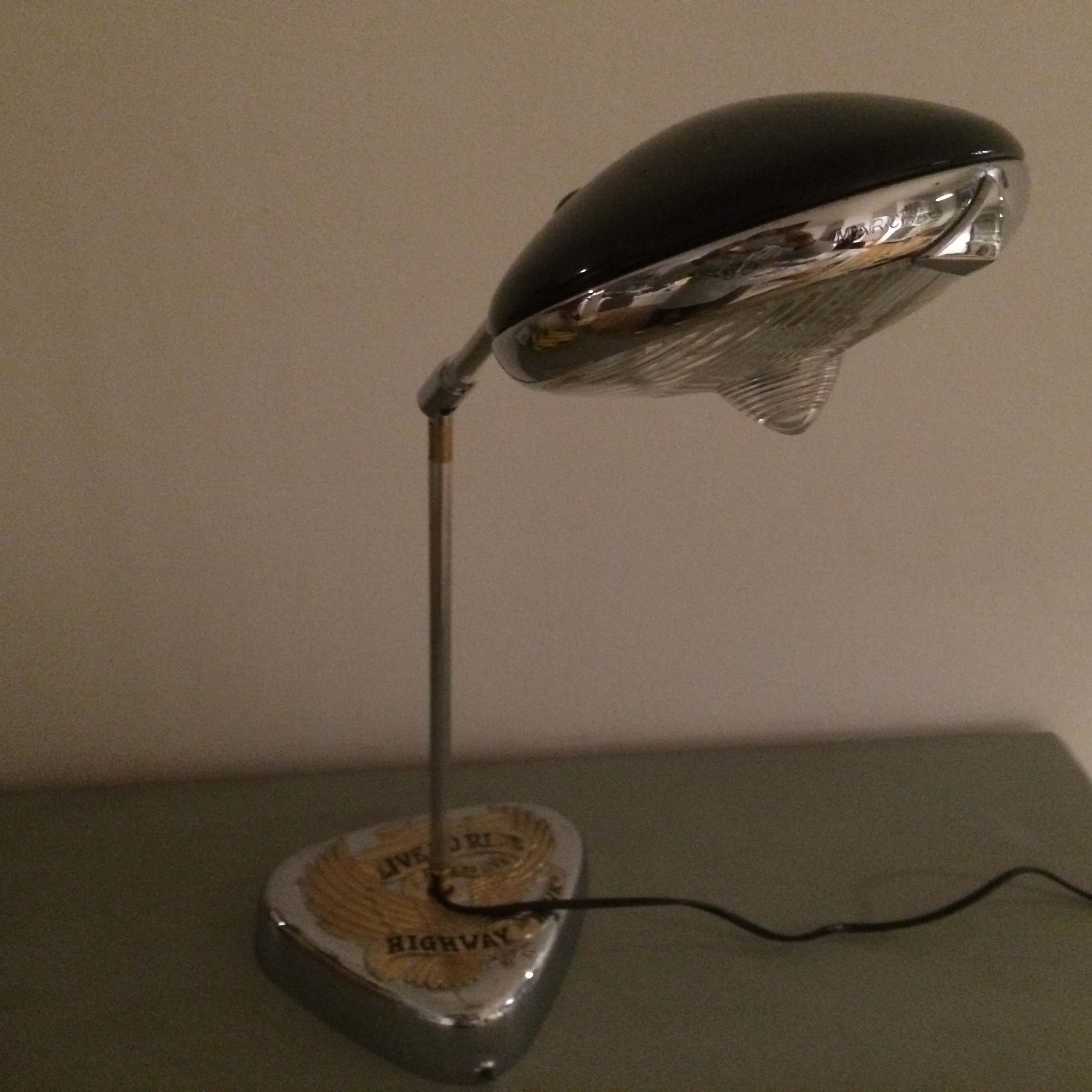 Lampe réalisée à partir d'un phare longue portée Marchal laqué noir. Le socle est un cache filtre de Harley Davinson