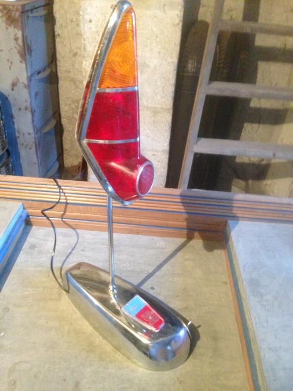 Lampe réalisée à partir d'un feu arrière de Simca Versailles des années 50/60. le socle est un cache réservoir de mobylette.