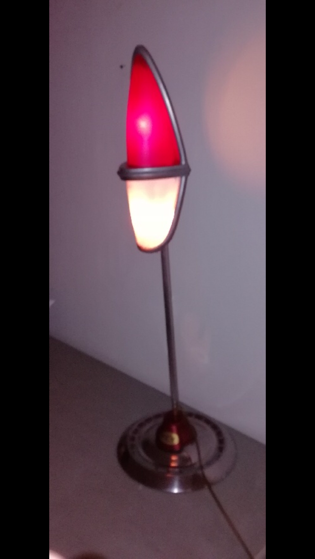 Lampe réalisée à partir d'un feu arrière de Simca Trianon. Véhicule style américaine des années 60. Le socle est un enjoliveur de roue.