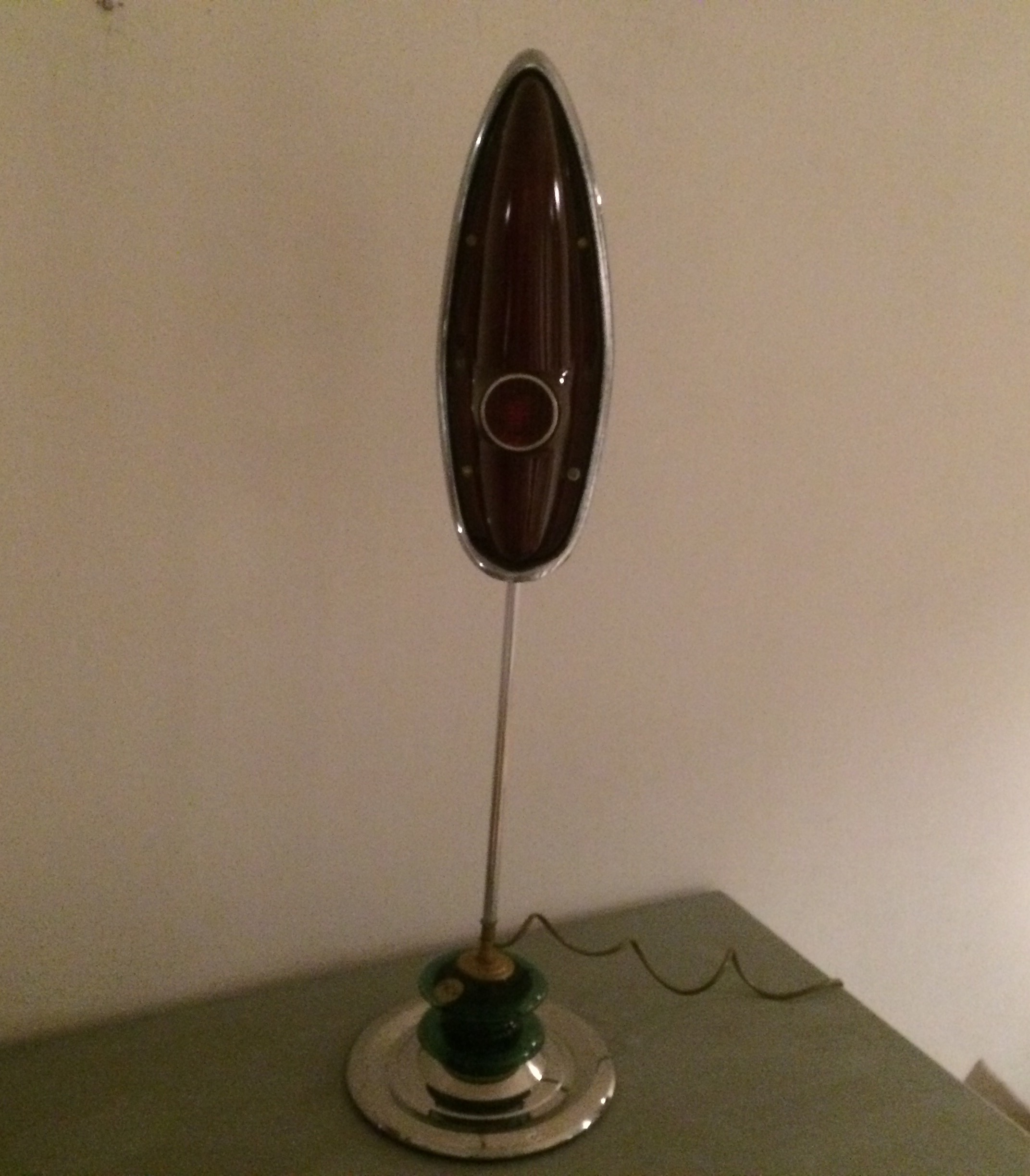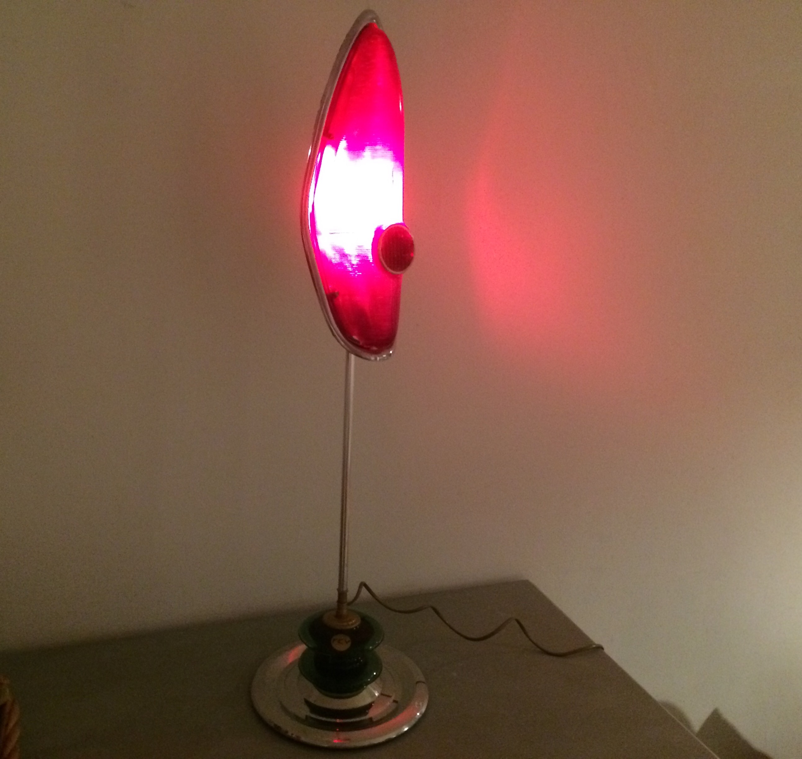 Lampe réalisée à partir d'un feu arrière d'une Simca Ariane. Véhicule style américaine des années 60. Le socle est un enjoliveur de roue.